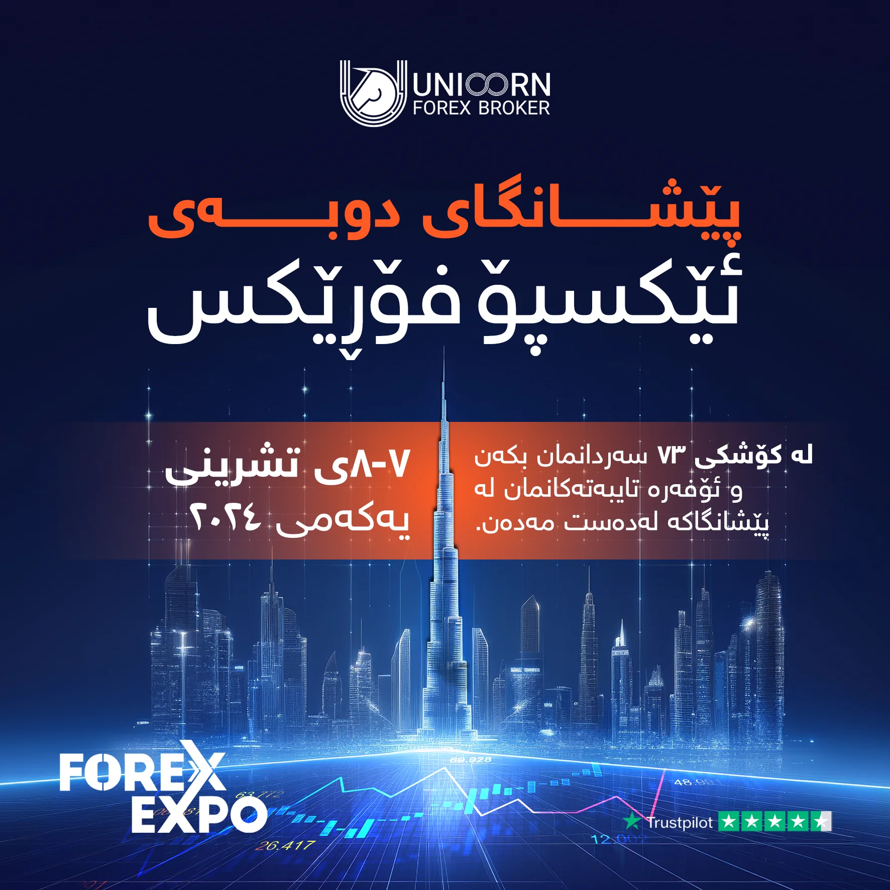 بەناوی یونیکۆرن فۆڕێکس برۆکەرز ، بە دڵسۆزانە بانگهێشتتان دەکەین بۆ سەردانی کۆشکی یونیکۆرن فۆڕێکس برۆکەرز لە پێشانگای تایبەتی فۆڕێکس دوبەی، کە بڕیارە لە ٧ و ٨ی (تشرینی یەکەمی-مانگی ١٠ )ی ٢٠٢٤، لە سەنتەری بازرگانی جیهانی دوبەی بەڕێوەبچێت.